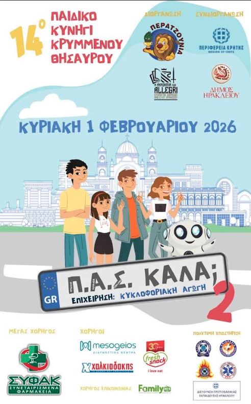 Τον κύκλο των εκδηλώσεων θα ανοίξει το 14 ο Παιδικό Κυνήγι Κρυμμένου Θησαυρού την Κυριακή 1 Φεβρουαρίου στο Πάρκο Γεωργιάδη στις 11:00. Φέτος η ομάδα «Περατζούνια» και η Ακαδημία των “ALLEGRI” υπό την αιγίδα του Δήμου Ηρακλείου και την συνδιοργάνωση της Περιφέρειας Κρήτης, καλεί τα παιδιά της Ε’ και ΣΤ’ Δημοτικού στο «Π.Α.Σ. ΚΑΛΑ;»- Επιχείρηση: Κυκλοφοριακή Αγωγή.