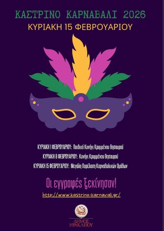 Οι αποκριάτικες εκδηλώσεις θα κορυφωθούν με το Καστρινό Καρναβάλι του Δήμου Ηρακλείου που θα πραγματοποιηθεί την Κυριακή 15 Φεβρουαρίου και στο οποίο, όπως κάθε χρόνο, μπορούν να συμμετέχουν σε αυτό μικροί και μεγάλοι για να ζήσουμε όλοι μαζί το χαρούμενο κλίμα των ημερών.