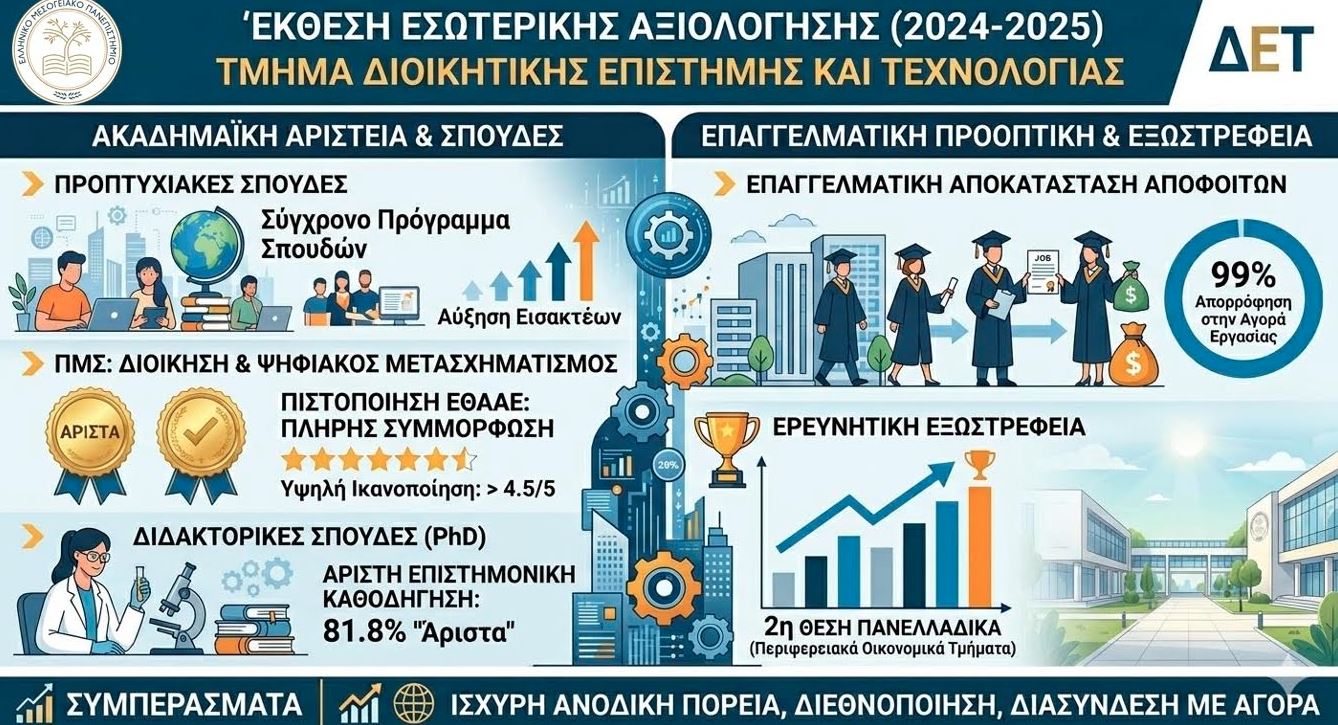 Ιδιαίτερη αναφορά γίνεται στο Πρόγραμμα Μεταπτυχιακών Σπουδών «Διοίκηση και Ψηφιακός Μετασχηματισμός», το οποίο πιστοποιήθηκε πρόσφατα με έξι «Άριστα» από την ΕΘΑΑΕ σε έξι κατηγορίες πιστοποίησης και καταγράφει εξαιρετικά υψηλά ποσοστά ικανοποίησης (άνω του 4,5/5) από τους φοιτητές. Παράλληλα, το Διδακτορικό Πρόγραμμα Σπουδών διακρίνεται για την άριστη επιστημονική καθοδήγηση την οποία το 81,8% των υποψηφίων βαθμολογεί με το απόλυτο άριστα.