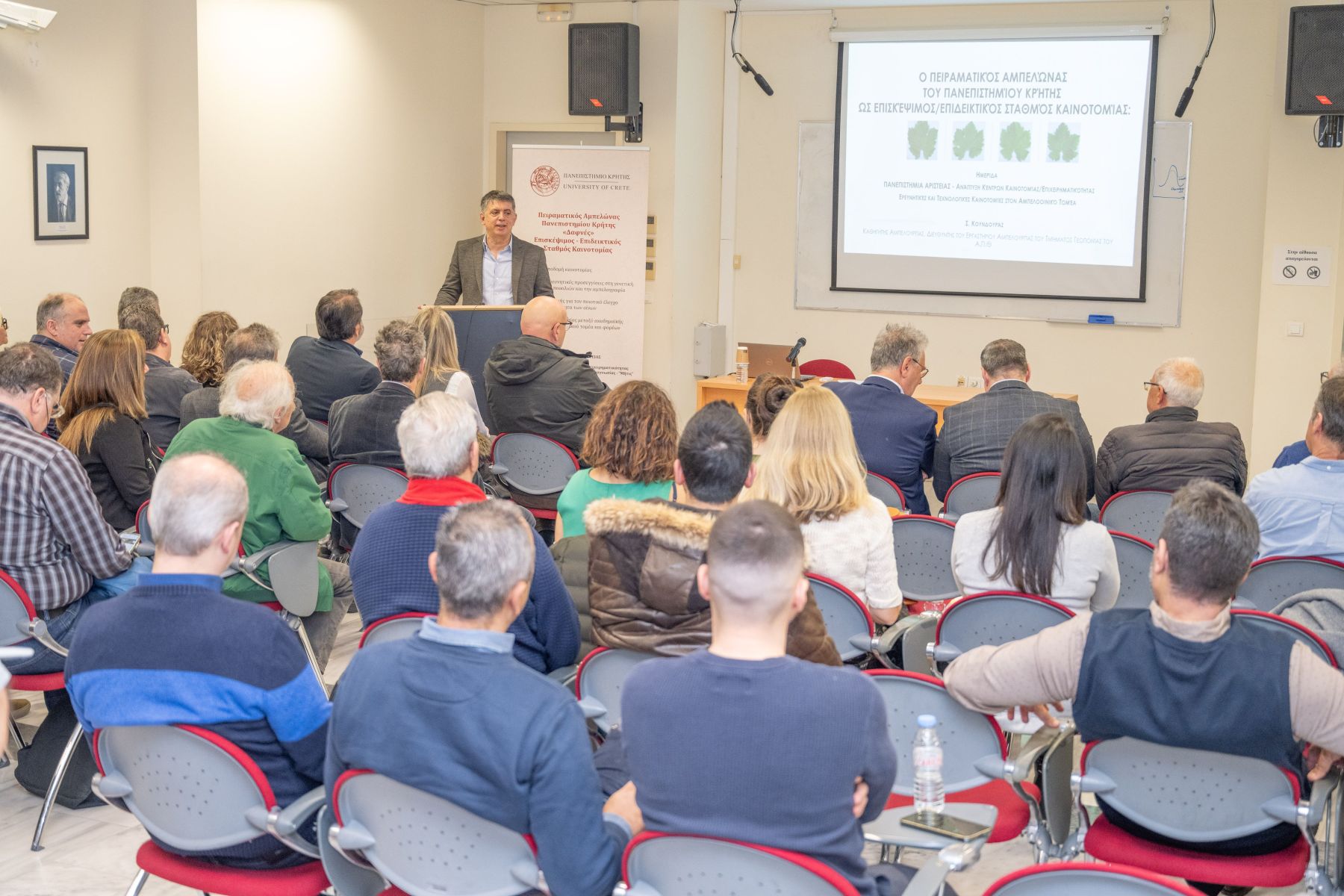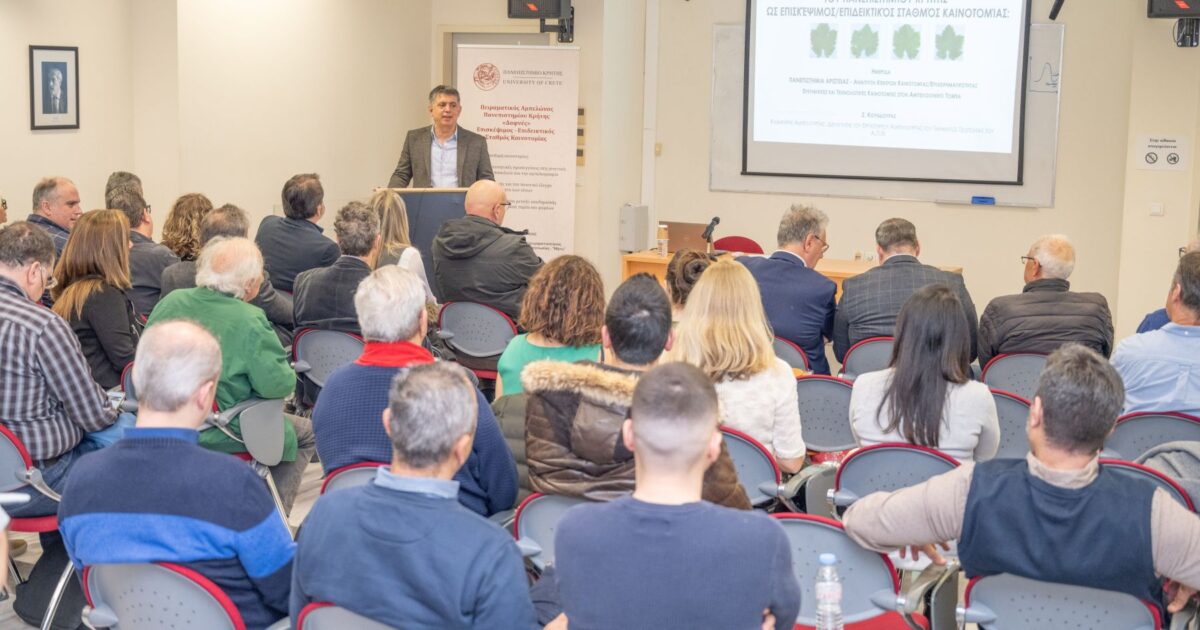 Το μέλλον της αμπελοοινικής παραγωγής στην Κρήτη -από τη διατήρηση της μοναδικής βιοποικιλότητας της αμπέλου έως τις τεχνολογίες αιχμής για την ποιότητα και αυθεντικότητα των οίνων- βρέθηκε στο επίκεντρο της ημερίδας με τίτλο “ΠΑΝΕΠΙΣΤΗΜΙΑ ΑΡΙΣΤΕΙΑΣ | Ανάπτυξη Κέντρων Καινοτομίας / Επιχειρηματικότητας – Ερευνητικές και Τεχνολογικές Καινοτομίες στον Αμπελοοινικό Τομέα”, που πραγματοποιήθηκε την Παρασκευή 13 Φεβρουαρίου 2026 στην Πανεπιστημιούπολη Βουτών Ηρακλείου.