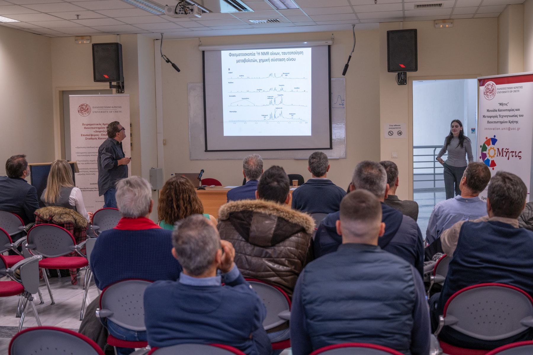Ολοκληρώνοντας τις ομιλίες, στις τεχνολογίες αιχμής για τον ποιοτικό έλεγχο των οίνων αναφέρθηκε ο Απόστολος Σπύρος, καθηγητής Χημείας στο Πανεπιστήμιο Κρήτης, παρουσιάζοντας τη συμβολή της φασματοσκοπίας πυρηνικού μαγνητικού συντονισμού (NMR) στον έλεγχο των κρασιών. Μία τεχνολογία που εξασφαλίζει την αυθεντικότητα και την ποικιλιακή προέλευση των οίνων που φτάνουν στον καταναλωτή, προστατεύοντας τόσο την εμπιστοσύνη του κοινού όσο και τη φήμη και ανταγωνιστικότητα του κρητικού αμπελοοινικού τομέα.