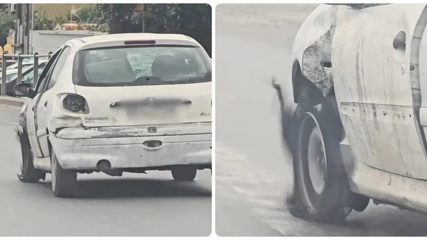 Σύμφωνα με τις τοπικές πηγές, πίσω από το τιμόνι του αυτοκινήτου βρισκόταν ένας νεαρός, ο οποίος συνέχιζε να οδηγεί αμέριμνος και χωρίς ίχνος ανησυχίας, παρά την εμφανώς επικίνδυνη κατάσταση του οχήματος.