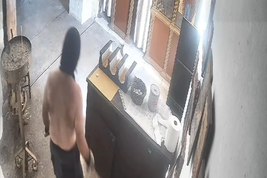Κάποια στιγμή, αντιλήφθηκε πως μέσα στην εκκλησία υπήρχε κάμερα ασφαλείας που κατέγραφε τις κινήσεις του. Έτσι, βγήκε έξω από τον ιερό ναό βρήκε ένα κομμάτι ξύλου ή σίδερου και έσπασε την κάμερα.