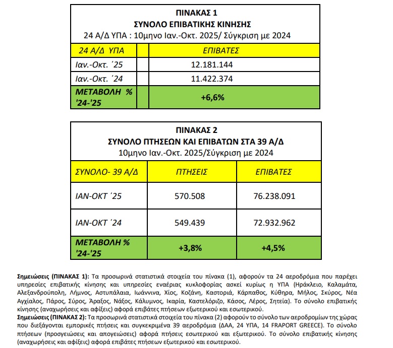 Άνοδο 6,6% παρουσίασε η επιβατική κίνηση στα 24 αεροδρόμια διαχείρισης της ΥΠΑ (Ηράκλειο, Καλαμάτα, Αλεξανδρούπολη, Λήμνος, Αστυπάλαια, Ιωάννινα, Χίος, Κοζάνη, Καστοριά, Κάρπαθος, Κύθηρα, Μήλος, Σκύρος, Νέα Αγχίαλος, Πάρος, Σύρος, Άραξος, Νάξος, Κάλυμνος, Ικαρία, Καστελόριζο, Κάσος, Λέρος, Σητεία) το χρονικό διάστημα Ιανουαρίου – Οκτωβρίου 2025 (δεκάμηνο 2025), σε σχέση με το αντίστοιχο του 2024.