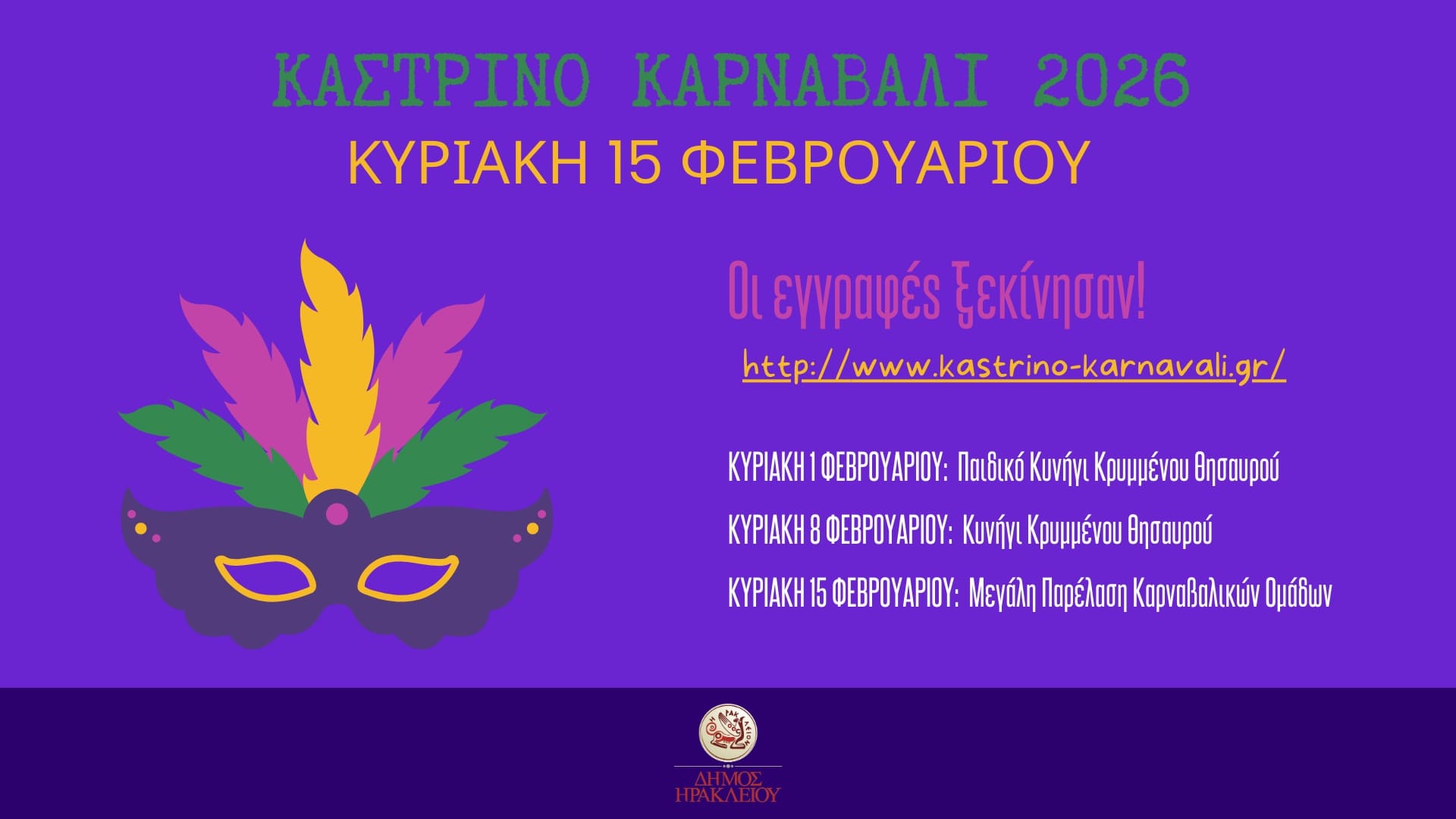 Όπως κάθε χρόνο, με το Καστρινό Καρναβάλι θα κορυφωθούν οι αποκριάτικες εκδηλώσεις του Δήμου Ηρακλείου, ο οποίος καλεί ομάδες, σχολεία, παιδικούς σταθμούς, αθλητικά σωματεία, πολιτιστικούς συλλόγους, ομάδες Κυνηγιού Κρυμμένου Θησαυρού να δώσουν το παρόν και να συμμετέχουν στην μεγάλη διοργάνωση.
