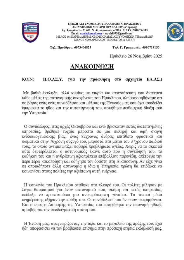 Η Ένωση Αστυνομικών Υπαλλήλων Ηρακλείου, με το επισυναπτόμενο έγγραφό της, εκφράζει έντονη απογοήτευση για την πειθαρχική δίωξη που ασκήθηκε σε αστυνομικό, ο οποίος όντας εκτός υπηρεσίας, παρενέβη για να προστατεύσει μια γυναίκα από ενδοοικογενειακή βία και οδήγησε τον δράστη στη Δικαιοσύνη.