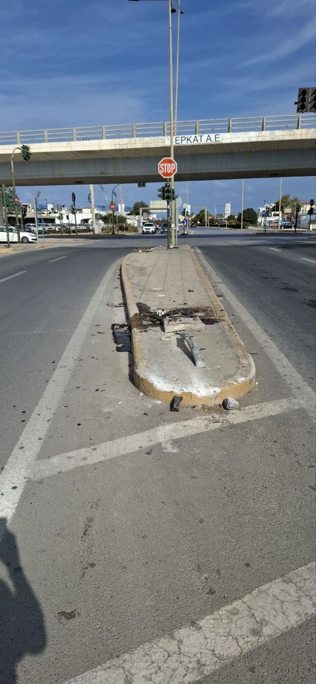 Ένα αυτοκίνητο καβάλησε το κράσπεδο και έπεσε πάνω σε στύλο φωτισμού στη νησίδα, με αποτέλεσμα ο στύλος ηλεκτροφωτισμού να… γκρεμιστεί στο έδαφος.
