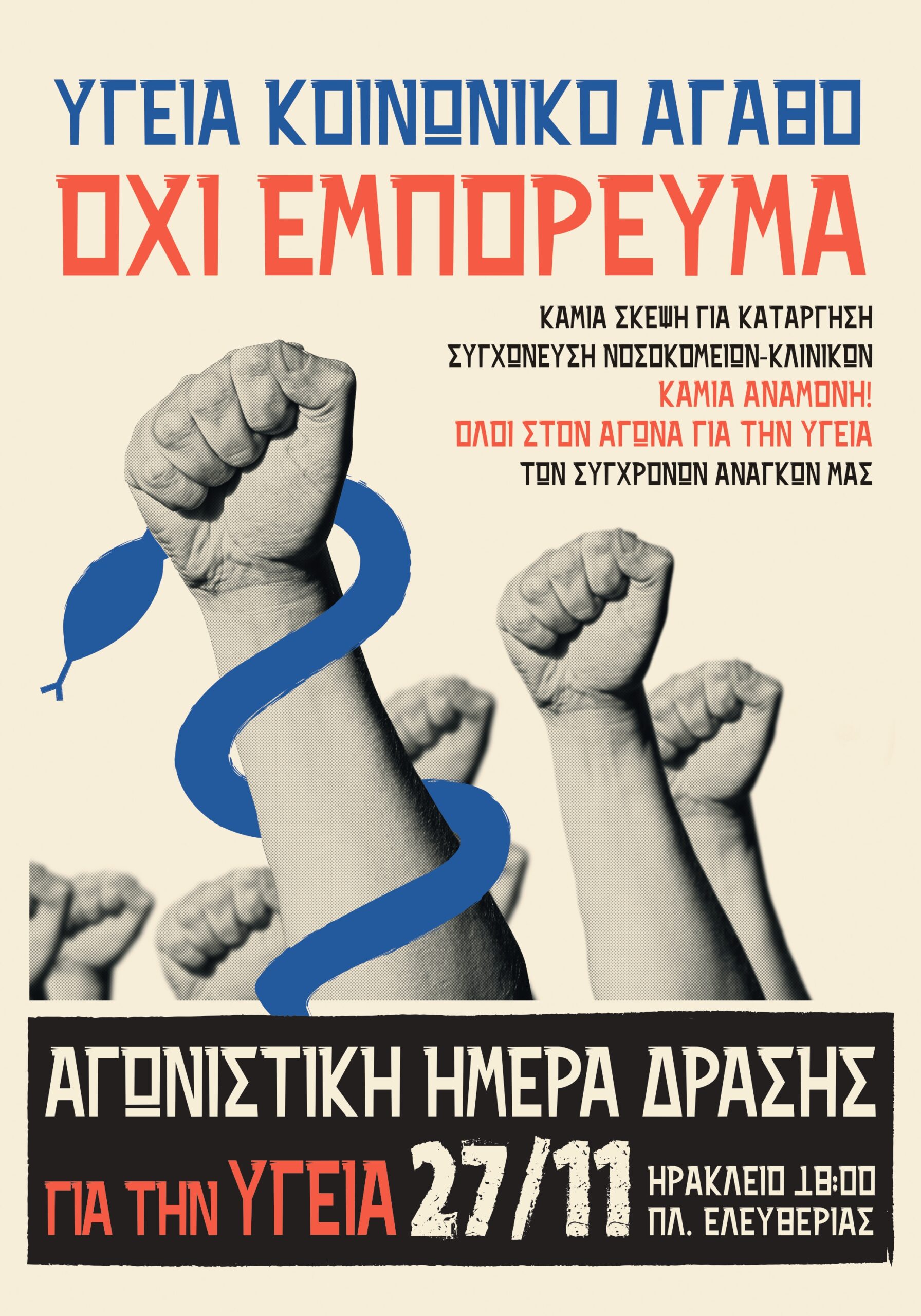 Καθημερινά μεγαλώνει ο αριθμός των σωματείων, συλλόγων και άλλων φορέων που δηλώνουν τη στήριξη τους στην αγωνιστική ημέρα δράσης για την υγεία, την Πέμπτη 27 Νοεμβρίου 6μμ στην πλατεία Ελευθερίας στο Ηράκλειο.