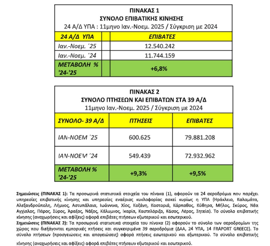 Άνοδο 6,8% παρουσίασε η επιβατική κίνηση στα 24 κρατικά αεροδρόμια διαχείρισης της Υπηρεσίας Πολιτικής Αεροπορίας (ΥΠΑ) (Ηράκλειο, Καλαμάτα, Αλεξανδρούπολη, Λήμνος, Αστυπάλαια, Ιωάννινα, Χίος, Κοζάνη, Καστοριά, Κάρπαθος, Κύθηρα, Μήλος, Σκύρος, Νέα Αγχίαλος, Πάρος, Σύρος, Άραξος, Νάξος, Κάλυμνος, Ικαρία, Καστελόριζο, Κάσος, Λέρος, Σητεία) το χρονικό διάστημα Ιανουαρίου – Νοεμβρίου 2025 (εντεκάμηνο 2025), σε σχέση με την αντίστοιχη περίοδο του 2024.