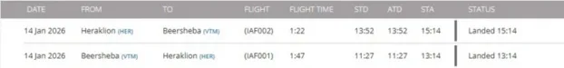 Σύμφωνα με τα διαθέσιμα στοιχεία από το Flightradar24, το «Wing of Zion» απογειώθηκε στις 11:27 το πρωί από τη Μπερ Σεβά, προσγειώθηκε στις 13:14 στην Κρήτη και απογειώθηκε εκ νέου λιγότερο από μία ώρα αργότερα. Η πτήση ολοκληρώθηκε με την επιστροφή του αεροσκάφους στη Μπερ Σεβά στις 15:14.