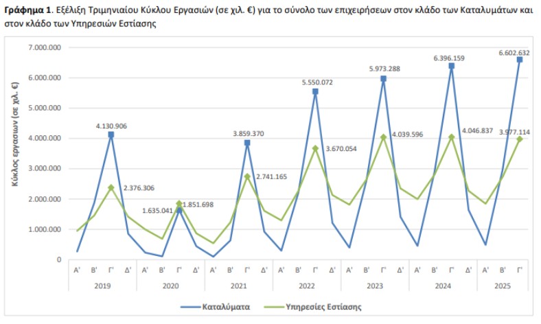 Την ίδια ώρα ο τζίρος στο σύνολο των επιχειρήσεων του κλάδου των υπηρεσιών εστίασης κινήθηκε προς την αντίθετη κατεύθυνση: Ο κύκλος εργασιών το τρίτο τρίμηνο 2025 ανήλθε σε 3.977.114 χιλ. ευρώ, σημειώνοντας μείωση 1,7% σε σχέση με το τρίτο τρίμηνο 2024, όπου είχε ανέλθει σε 4.046.837 χιλ. ευρώ.