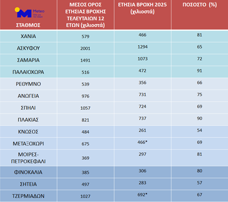 Τα στοιχεία παρουσιάζονται στον πίνακα που ακολουθεί (με αστερίσκο σημειώνονται δύο σταθμοί με μικρή απώλεια δεδομένων βροχής μέσα στο 2025).